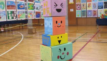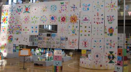 学年ごとに子どもたち一人一人の力を合わせて制作しました。写真は6年生、4年生、3年生の作品です。
