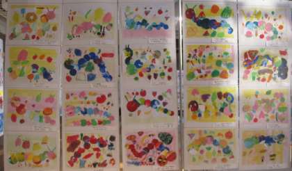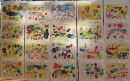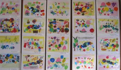 『はらぺこあおむし』の絵本を読み「ぼく、わたしのあおむし」を考えました。あおむしの体は、ローラーを使って色を付けました。あおむしが食べたいと思うものをクレパスで描き、色鮮やかな『カラフルあおむし』が誕生。