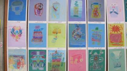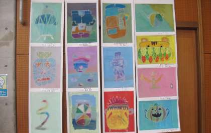 見知らぬ公園の白くてきれいな砂場から、つぼが出てきました。「これはふしぎなつぼです」とあります。いったいどんなつぼなのでしょう。イメージを広げて、ボンドと砂で描きました。