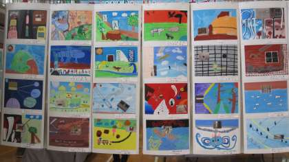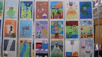写真の周りには、どんな世界が広がっているのかな?とイメージを広げて表しました。よく見ると、見たことのある玉堤の廊下や階段の写真もありますね。周りに広がるのは、見たことのない世界。言葉では表せない世界を、形と色で表しました。