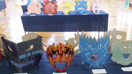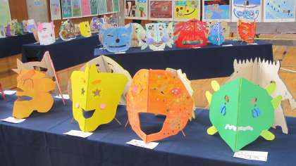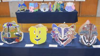 気持ちを表す表情について考えながらつくりました。初めての電動糸のこぎりに緊張しながらも、思い思いの仮面ができあがりました。それぞれの仮面は、どんな時の顔か、想像してみてください。