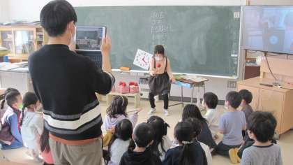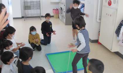 「ふゆと ともだち」でけん玉、コマ、だるま落とし、あやとり、お手玉等、昔遊びに取り組んできました。今日は身に付けた技をみんなの前で披露しました。リモートで参加している子も得意技の発表をしました。