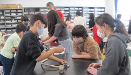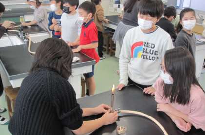 ガスバーナーの使い方について学びました。やり方を理解した後に、実際にマッチを擦って体験しました。ガスバーナーに火を近づけるときは、とても緊張しているようでした。何回かの練習でスムースに操作できるようになりました。