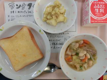 今日の給食は、フルーツレモンのはちみつトースト、牛乳、ジャーマンカレーポテト、白インゲン豆のスープです。
