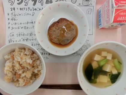 今日の給食は、豆じゃこごはん、牛乳、いわしのつくね焼き、三つ葉のすまし汁です。