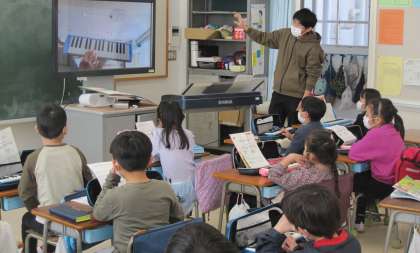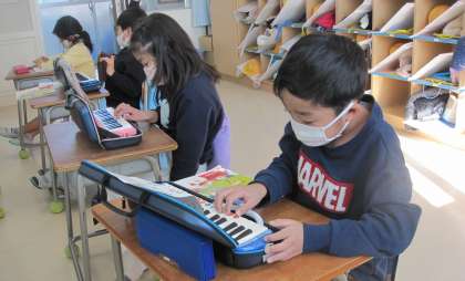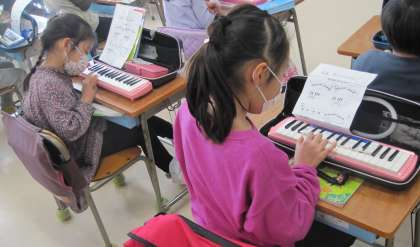 音楽専科教諭が編曲した『かえるの がっしょう 〜スペシャルコース〜』に取り組んでいます。映像で模範の指使いを見て、繰り返し練習しました。