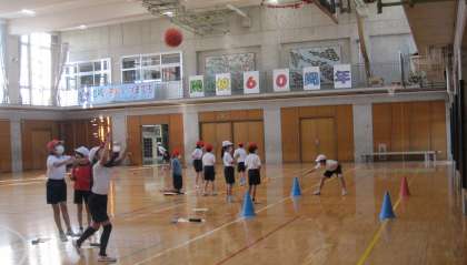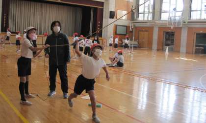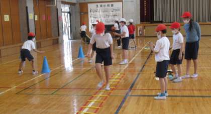「体つくり運動」に取り組んでいます。多様な動きを身に付け、動きの質を高めていきます。記録をカードに記入し、次の目標を立てます。子どもたちは楽しみながら挑戦していました。
