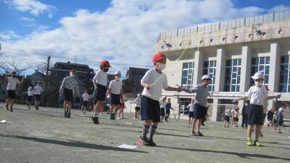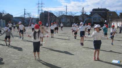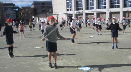リズム縄跳びに取り組んでいます。音楽のリズムに乗って、できるようになった技で、気持ちよさそうに跳んでいました。