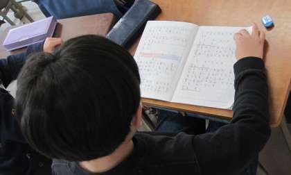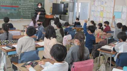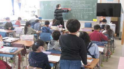 図を使って考えます。自分がつかんだ赤、青のおはじきの数で問題を考え、式を立てるので、全員違う問題にチャレンジしています。