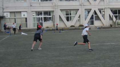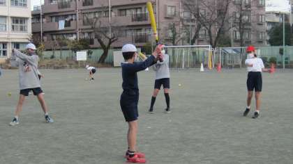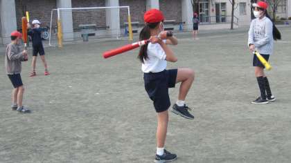 ベースボール型のボール運動「ティーボール」の学習を進めています。よりゲームが楽しめるように、バットの振り方やボールキャッチの仕方も練習しました。素振りでは、グリップの握り方や重心移動も意識して取り組みました。