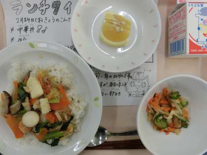 今日の給食は、中華丼、牛乳、大根と昆布のサラダ、くだもの(はるか)です。
