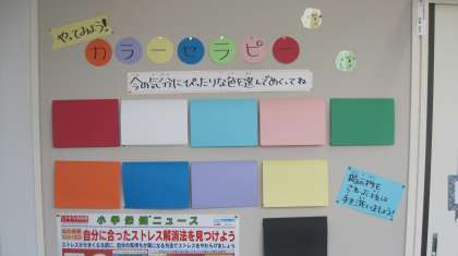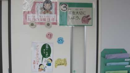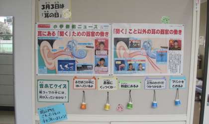 保健室前の掲示物は、いつも子どもたちが楽しみにしています。耳の器官の働きについて興味もって読んでいました。音あてクイズにもチャレンジしていました。