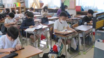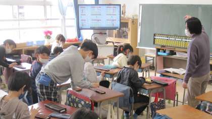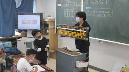 「そろばん」は、日常生活でほとんど使うことがなくなりましたが、算数の学習で取り組んでいます。子どもたちは、興味をもって楽しんでいました。