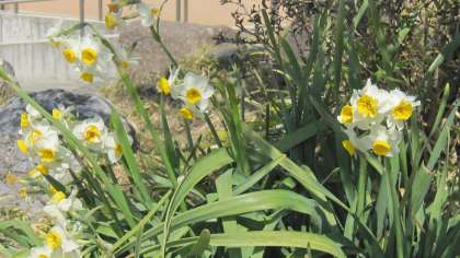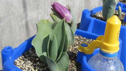 1年生が植えたチューリップの球根が芽を出し、つぼみを付けました。子どもたちは大切に育てています。校庭の花も美しく咲いています。