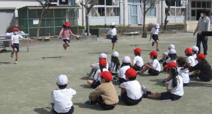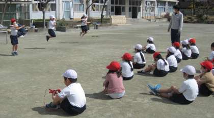 縄跳びでできるようになった技を友達の前で披露しました。友達が応援する中、一生懸命跳んでいました。