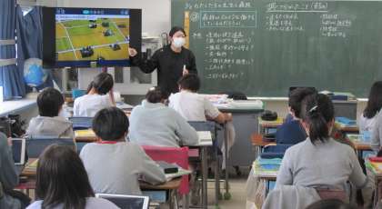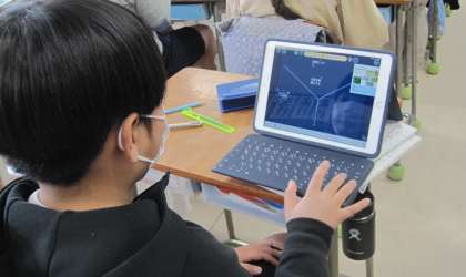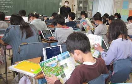 森林はどのような働きをしているのかについて、予想を立て、調べて分かったことを発表しました。たくさんの資料から情報を整理し、ロイロノートを活用して入力していました。