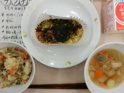 今日の給食は、かやくごはん、牛乳、お好み焼き、船場汁です。