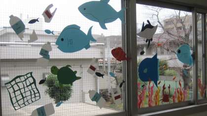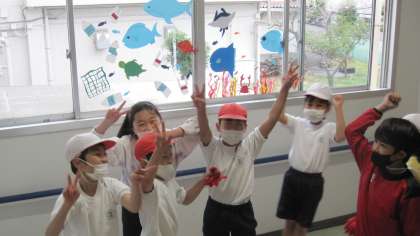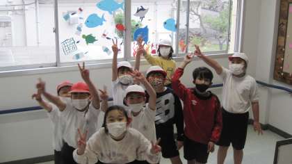 6年生の図工作品を写真に撮っていたら、体育の授業から戻ってきた3年生がポーズを決めました。