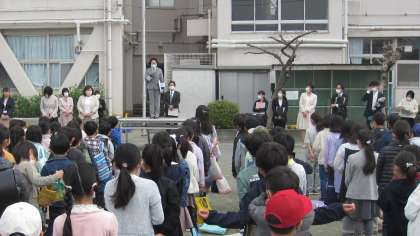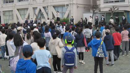 新任式では、学校長から転出した教職員のお知らせと転入教職員の自己紹介がありました。子どもたちは、礼儀正しくあいさつしていました。