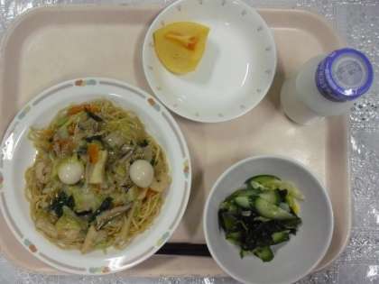 今日のメニューは、あんかけ焼きそば、ワカメサラダ、かき、牛乳でした。