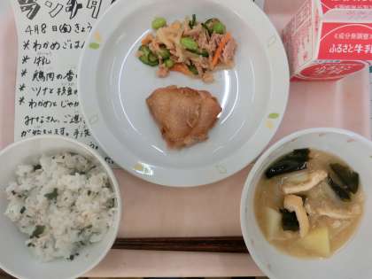 今日の給食は、わかめごはん、牛乳、鶏肉の香味焼き、ツナと枝豆のサラダ、じゃがいものみそ汁です。
