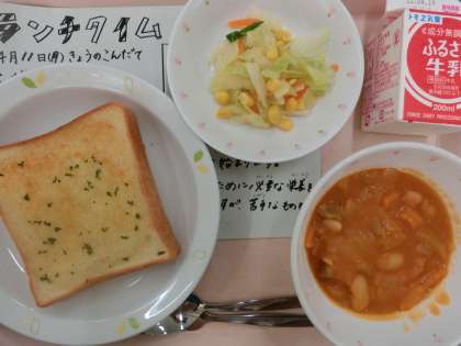 今日の給食は、ガーリックトースト、牛乳、コーンサラダ、ビーンズポークシチューです。