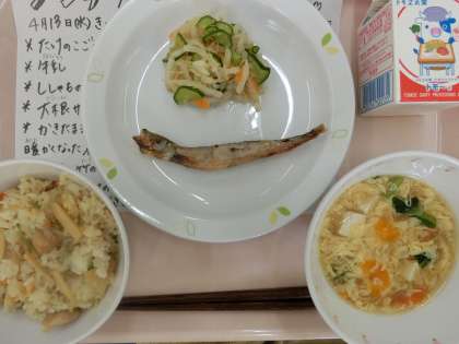 今日の給食は、たけのこごはん、牛乳、ししゃものから揚げ、大根サラダ、かきたま汁です。
