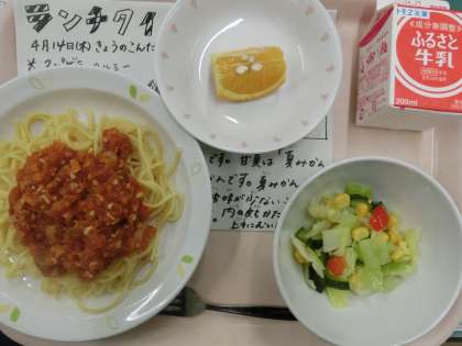 今日の給食は、スパゲティヘルシーミートソース、牛乳、カラフルサラダ、くだもの(甘夏)です。