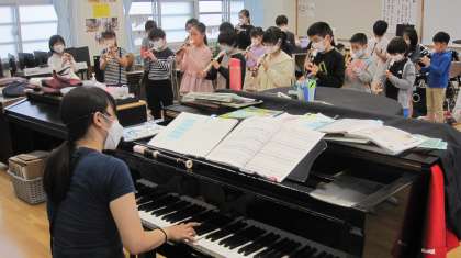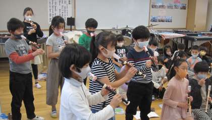 リコーダーを学校で演奏するのは、2年ぶりになります。感染症対策を十分に行い、工夫して演奏しています。『ブラックホール』を早いテンポでリズミカルに演奏していました。「リズムチャレンジ」は『Mela!』の曲でノリノリでした。