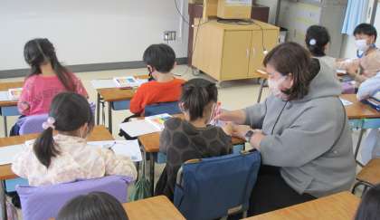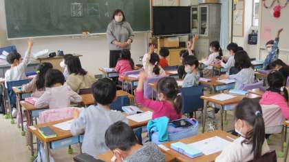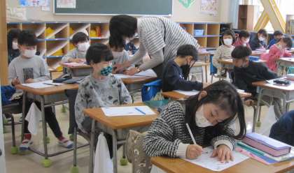 毎日ひらがなの学習をしています。今日は「へ」の美しい形を意識しながら練習したり、「へ」のつく言葉を探して発表したりしました。担任に丸をもらうと喜んでいました。