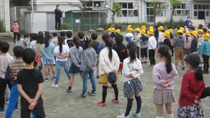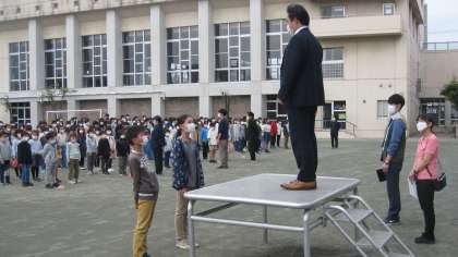 学校長は、命を大切にする交通安全についてお話をしました。代表委員からは、運動発表会に向けてのスローガン募集の案内がありました。1年生は、今回から全校朝会に参加しています。