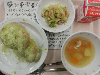 今日の給食は、うぐいすあげぱん、牛乳、ビーンズサラダ、野菜スープです。