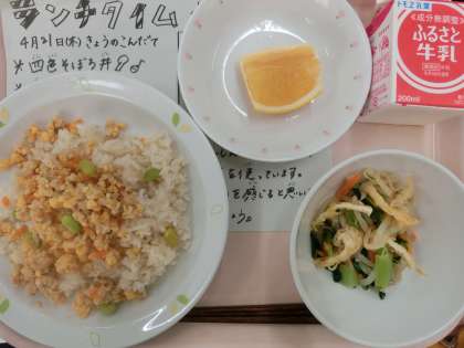 今日の給食は、四色そぼろ丼、牛乳、カリカリお揚げのあえもの、くだもの(美生柑)です。
