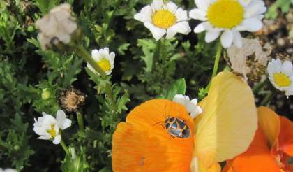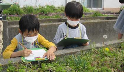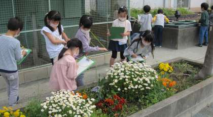 『春を見つけよう』 校庭に出て、子どもたちは見付けた春をじっくり観察していました。