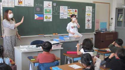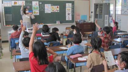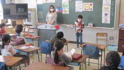 『My Profile Card』を作って、自己紹介をしました。出身地や好きなことを英語で伝え合いました。ALTと担任がティームティーチングで授業を進めています。