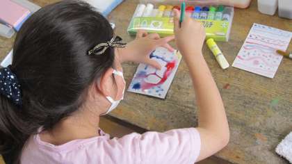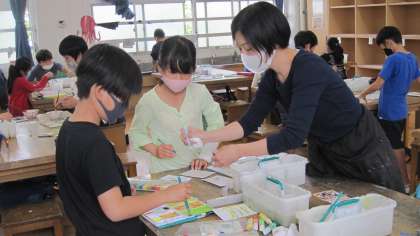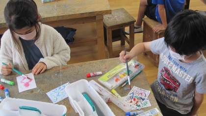 『えのぐ LABO』めあては、「絵の具でできることをたくさん見つけよう」です。色や筆づかい、水の量を変えて模様をつくりました。子どもたちは夢中になって取り組んでいました。