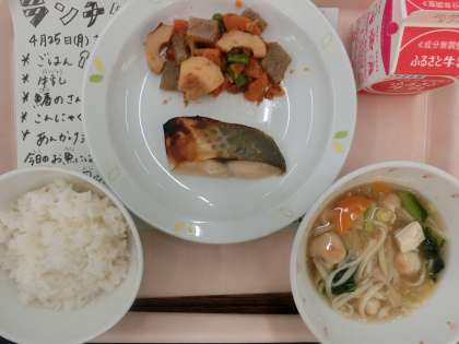 今日の給食は、ごはん、牛乳、鰆のさんしょうみそ焼き、こんにゃくと野菜のおかか煮、あんかけ汁です。