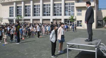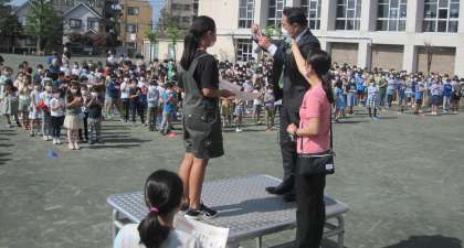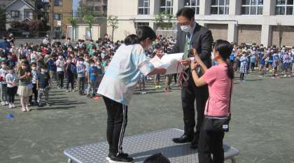 『ひとみきらきら 本にドキドキ』 学校長からは、こども読書週間、学校図書館の利用についての講話がありました。「全国書き初め展覧会」で入選した児童の表彰を行いました。