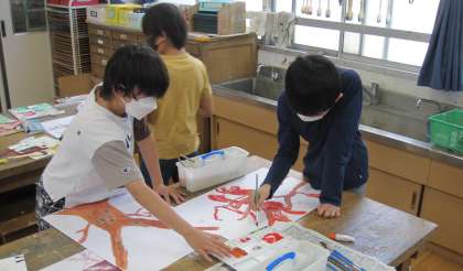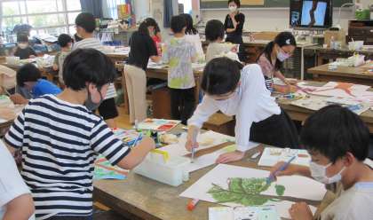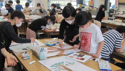 『木々を見つめて』 今日のめあては、「表し方を工夫して、作品をよりよく仕上げよう」です。絵の具、コンテパステル、ポスカ、色鉛筆を使用して、工夫して表現していました。