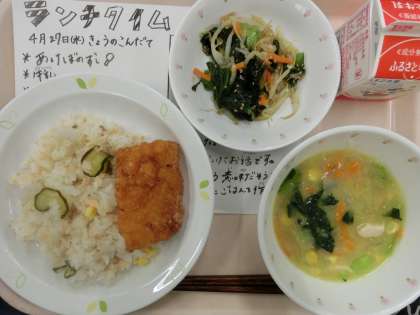 今日の給食は、あけぼのずし、牛乳、いかのかりんと揚げ、わかめのナムル、中華風コーンスープです。