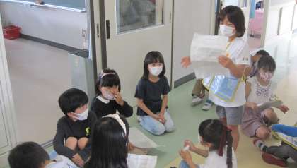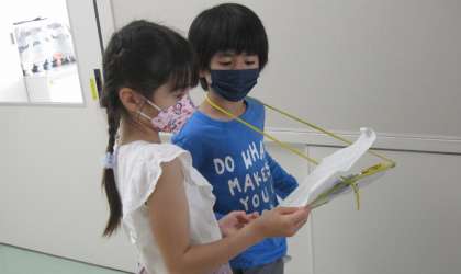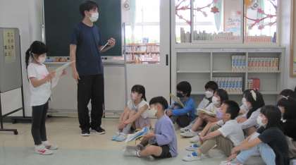 学校探検で1年生に説明をするリハーサルをしました。 現場に行き、相手に伝わるように、一生懸命練習していました。