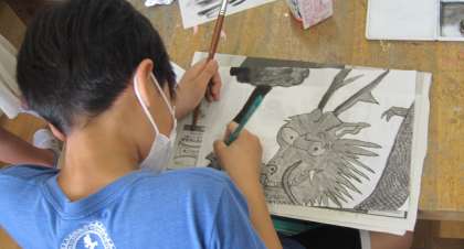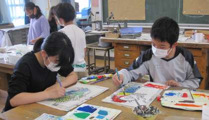 「龍神太鼓」の模様を表現しました。今日は、絵の具を使用して、龍の顔と鱗の仕上げをしました。