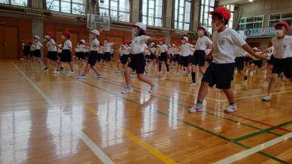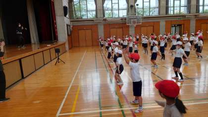 運動会に向けて、みんなが知っている曲に合わせて楽しく踊りの練習をしました。途中で、一人一人が考えた動きも取り入れました。(5月9日)