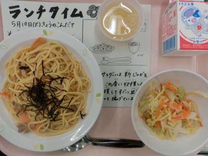今日の給食は、和風スパゲティ、牛乳、じゃがいものパリパリサラダ、りんごゼリーです。