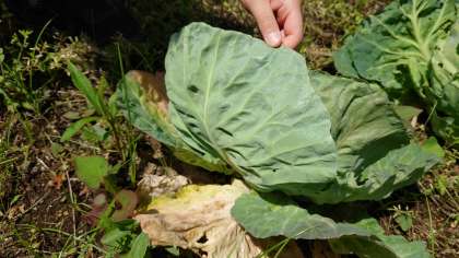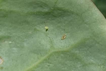 暖かくなってきたので、モンシロチョウを見かけるようになってきました。花壇に植えてあるキャベツの葉の裏を見ると、モンシロチョウのたまごを見つけました。(5月10日)