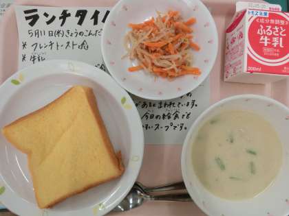今日の給食は、フレンチトースト、牛乳、にんじんとツナのサラダ、かぶのポタージュです。