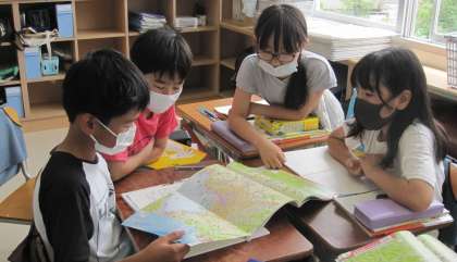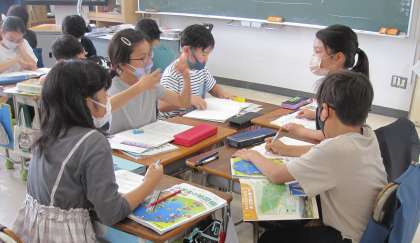 課題『東京都の特色をまとめよう』 土地の高さ、産業、交通を観点に一人一人が調べてきたことをもとに情報交換をしてまとめていきました。