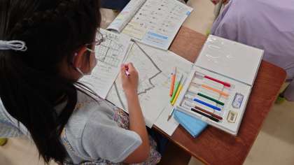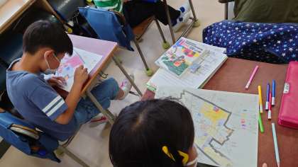 地域めぐりをしてわかったことを地図に表しました。見やすいように、色分けしたり地図記号を使いました。(5月12日)