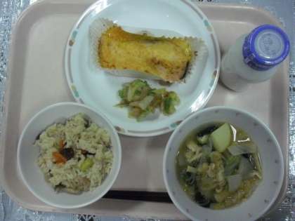 今日のメニューは、吹き寄せごはん、鮭の紅葉焼き、白菜のおかかあえ、味噌汁、牛乳でした。