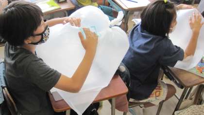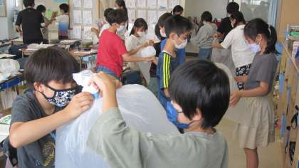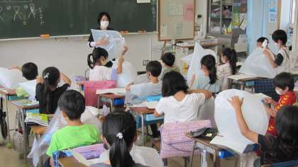 「空気と水」について学習しています。空気を袋に閉じ込め、押してみて、どんな感じがするか、意見交換しました。